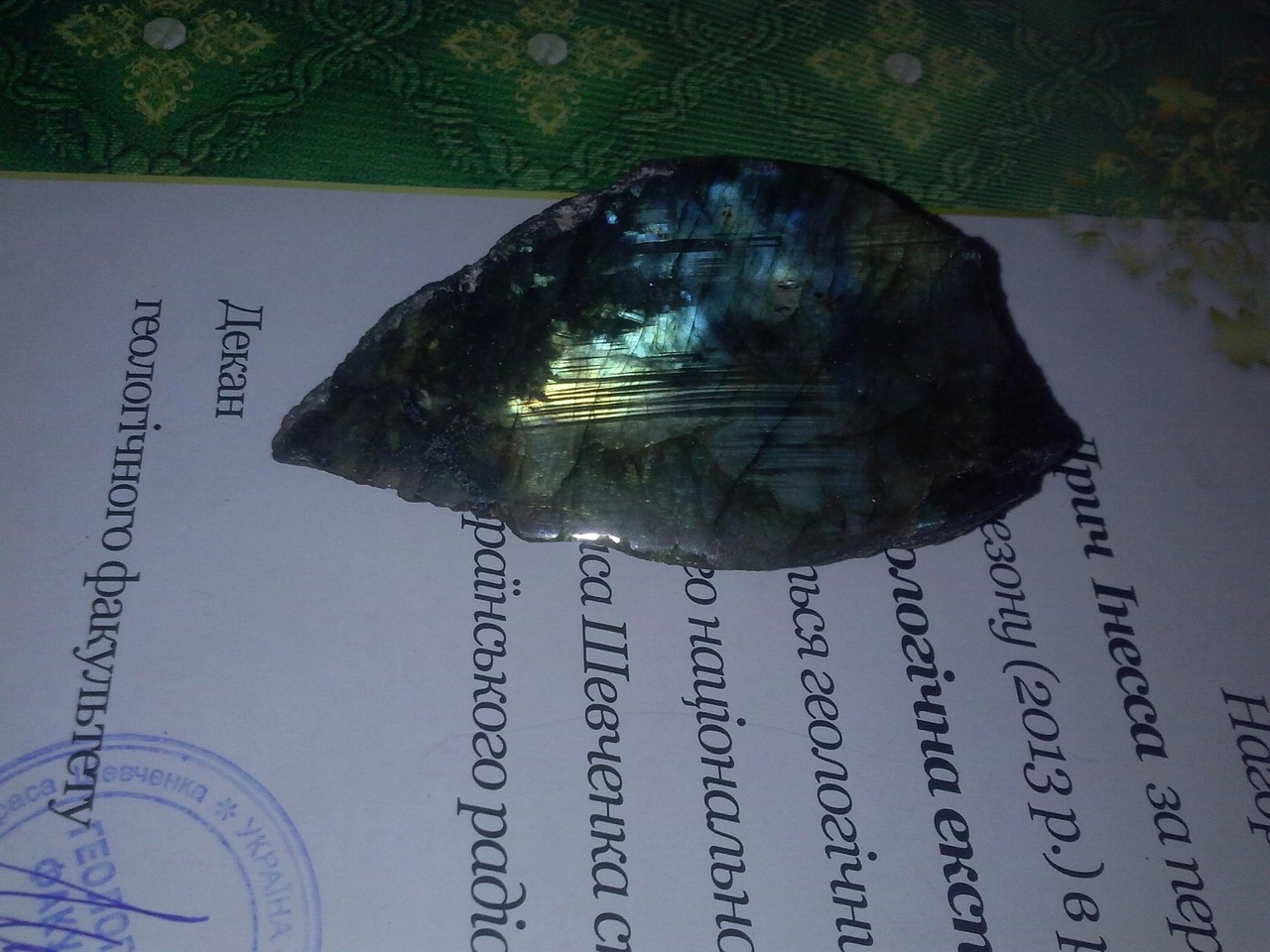 Однажды по радио или Интернету попался конкурс эссе про вулканы. Я написала работу про супервулканы, и мне отправили в подарок грамоту и неогранённый кусочек камня лабрадор. Чуть позже он очень вдохновит на один ужастик-рассказ, но не о нём сегодня.